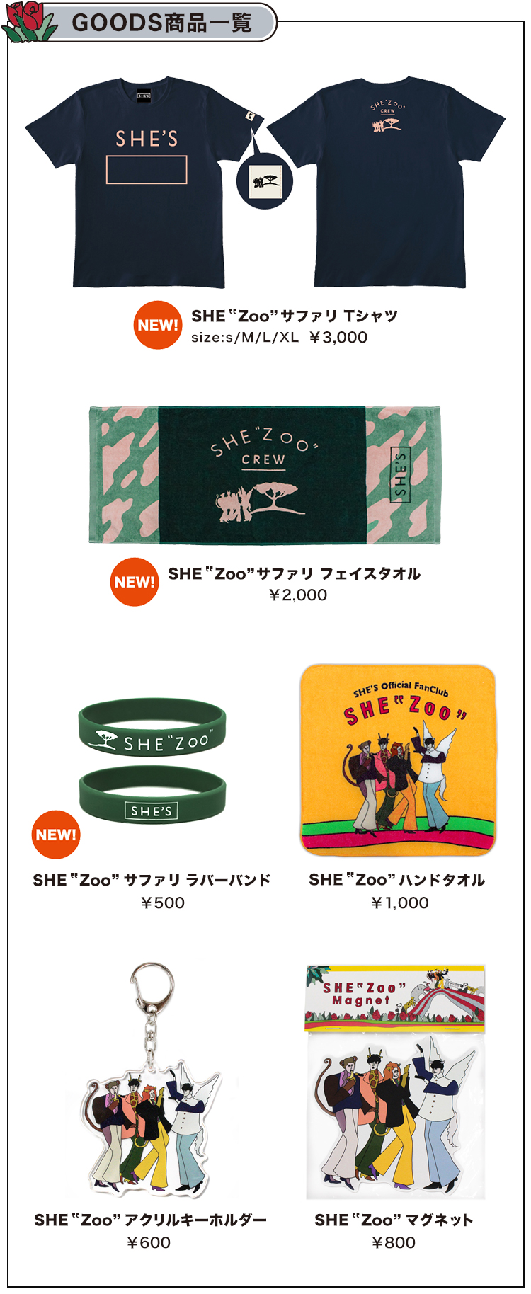 上記他、通常のSHE’Sグッズも一部販売しますので、是非会場でチェックしてみてください。