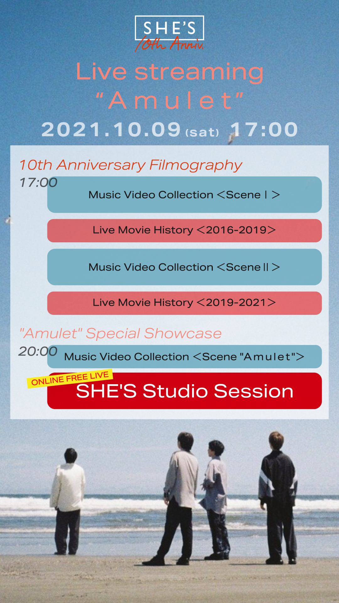 第一部は<10 thAnniversary Filmography>と題し、ミュージックビデオコレクションと過去のライブ映像で、第二部では<”Amulet” Special Showcase>と題して、最新アルバム『Amulet』収録楽曲のミュージックビデオ、さらにはオンライン・スタジオライブ【SHE’S Studio Session】が放送される。