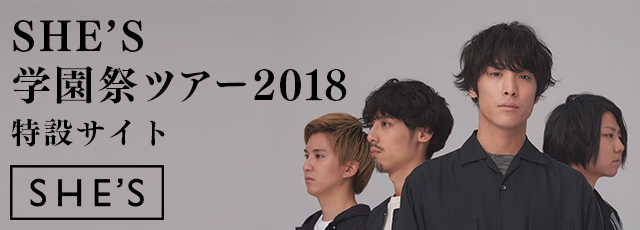 2018.08.02 学園祭ツアー開催決定!! SHE’S初の学園祭ツアーの開催が決定しました! 10~11月にかけて全国の学園祭を巡ります。 出演する学園祭は随時更新するので、以下特設サイトにてご確認ください。 学園祭ツアー特設サイト: