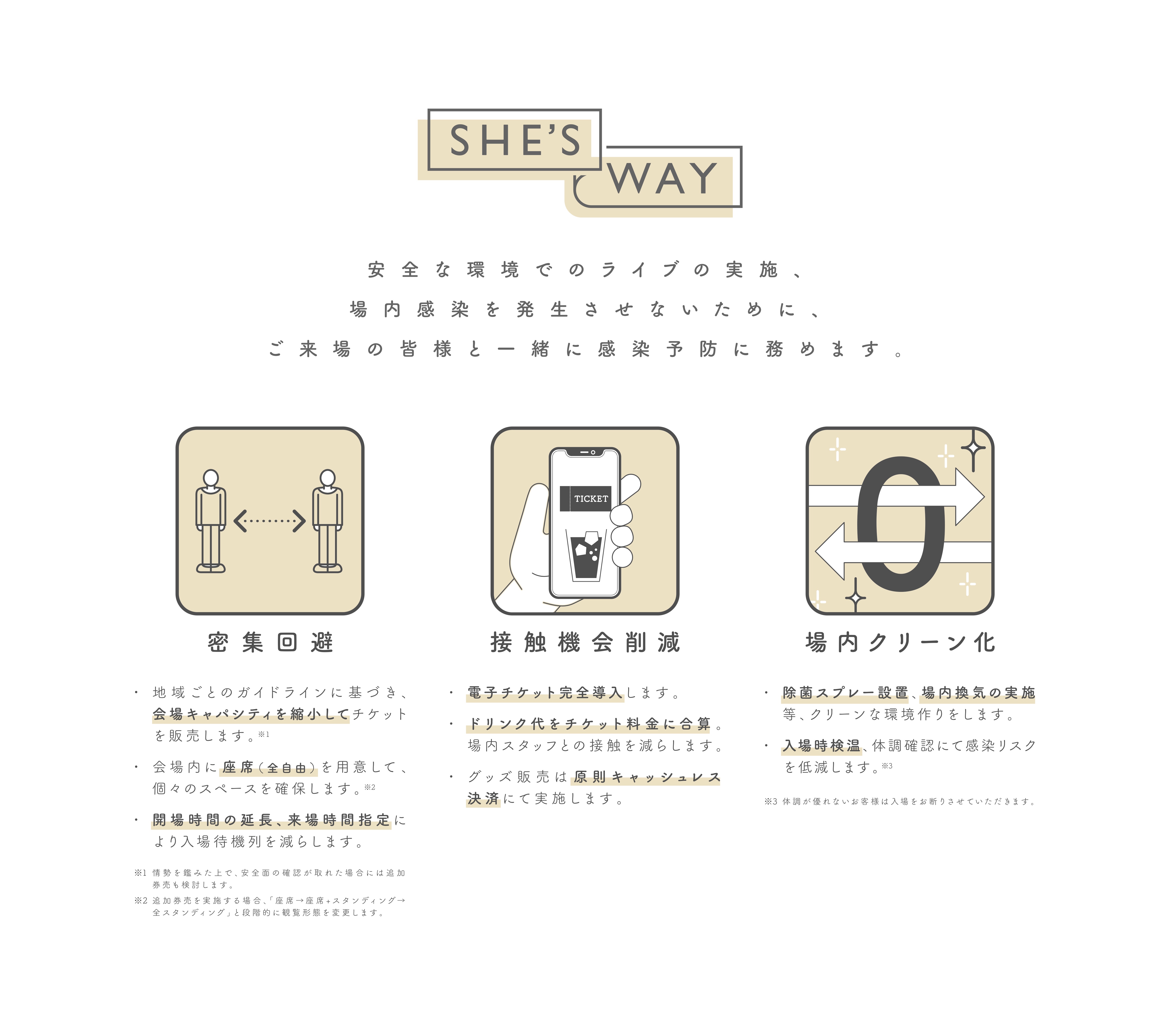 SHE’Sは今回のツアーを開催することにあたり、より安全なライブの環境作りと場内感染を発生させないために、各地域のガイドラインとは別に独自の取り組みを行います。