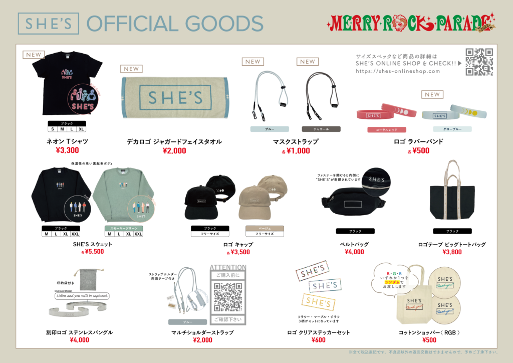※会場販売ラインナップはイベント・フェス毎に異なります。詳細はSHE’S公式Twitter/Instagramにてご確認ください。
